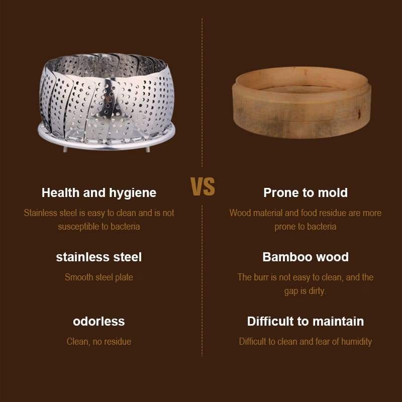 [FÁCIL DE LIMPIAR Y ALMACENAR] La superficie pulida evita que los alimentos se peguen a la vaporera, lo que facilita su limpieza y la hace extremadamente apta para el lavavajillas. Limpia la olla a vapor después de usarla y pliégala para ahorrar espacio de almacenamiento.