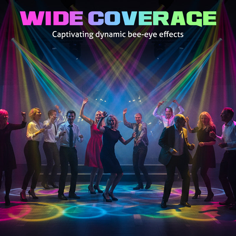 LENTE BEE-EYE INTEGRADA: la lente central bee-eye produce un fascinante efecto de lavado con múltiples haces nítidos. Añade profundidad y complejidad a tu configuración de iluminación, proporcionando efectos visuales de calidad profesional para escenarios, discotecas y fiestas.