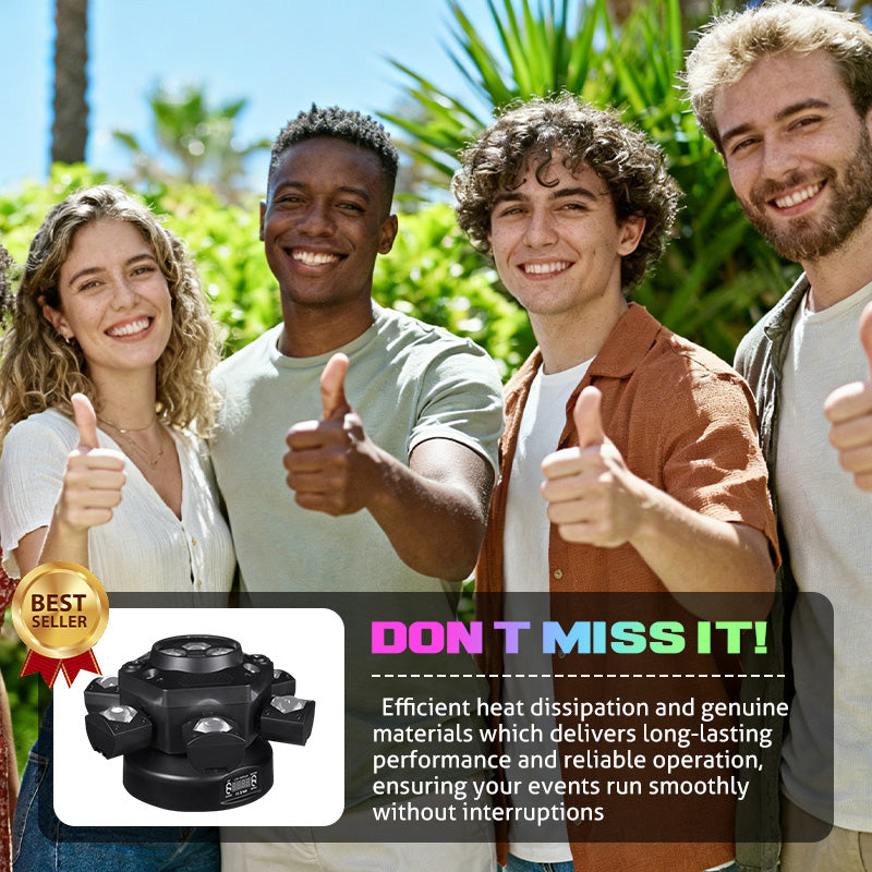 DISEÑO DINÁMICO DE SEIS BRAZOS: cuenta con seis brazos que se mueven de forma independiente, cada uno de los cuales proyecta un potente haz de luz. Esto crea efectos impresionantes que llenan la sala y espectáculos de luces energéticos que cautivan a cualquier público, mejorando el ambiente de su evento.